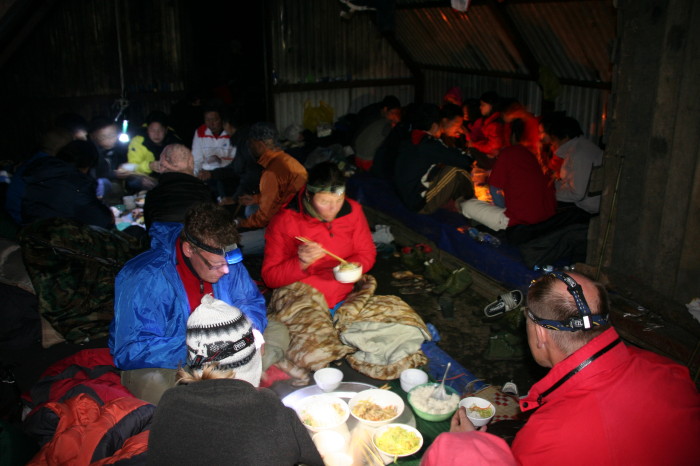 Camp 2800 reminded the army base. We got a metal hangar, which was fucking dank and with a constantly dripping condensation. Today we had so many night stayees so we had to share each mat by two persons. Hmong woman provided for sale all drinks they carried from valley … for double the price, of course. Next building wrapped in blue plastic was kitchen. Soon our friend piglet squeaked the last time. Rapidly darkened.
