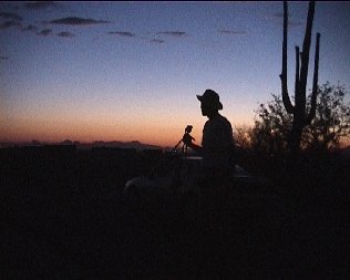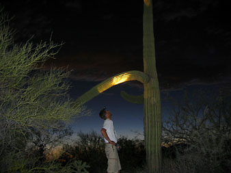 Tā nu iebraucām kaktusu mežos tikai īsi pirms saulrieta. Nebija laika īpaši lasīt, kas tur pie tās iebraukšanas bija rakstīts par atrašanos parkā nakts laikā – mums bija jāsteidz iemūžināt saulrieta skati. Strauji satumsa un apkārtne uzreiz atdzīvojās. Visur kaut kas čabēja, te pat aizskrēja zaķis, varbūt vēl kaut kas. Atklāti sakot es jau sāku nožēlot, ka biju noslinkojis uzvilkt zābakus. Skraidīju sandalēs ar vaļējiem purniem, tādēļ pirkstā varēja iedurties ne tikai kāds nepamanīts adatainis, bet arī čūska, skorpions un sazin vēl kas te klimta pa naktīm apkārt. Vietām zeme bija labi pārskatāma, bet citviet gadījās pa ērkšķu krūma audzei vai sakritušiem kaktusu stumbriem. Un, pats par sevi saprotams, tieši šādās vietās bija paši labākie skatu punkti pēdējām krēslas bildēm.