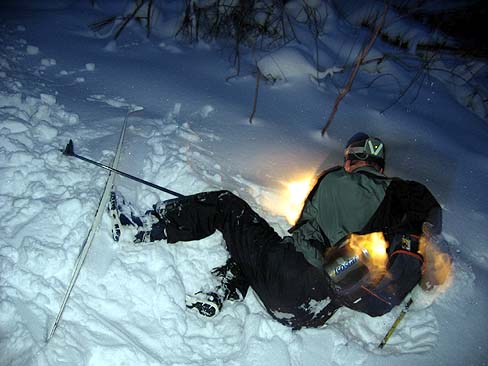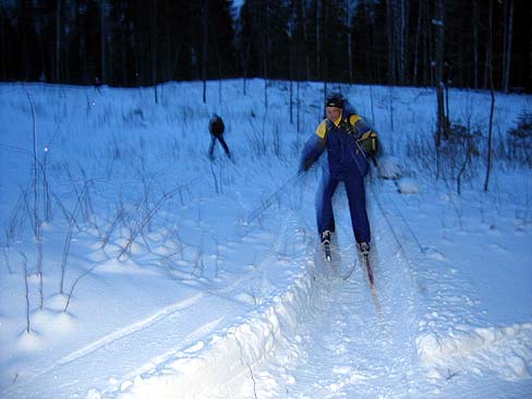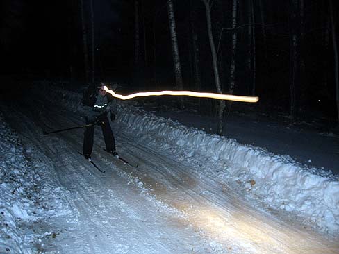 Kā jau varat redzēt, mums satumsa. Tās strīpas ir no lukturīšiem. Ceļš šajā posmā bija iebraukts ar sniega moci. Tas nepalīdzēja, jo ar distanču slēpēm tumsā TĀDAS virāžas un nobraucienus vienalga nevarēja paņemt.