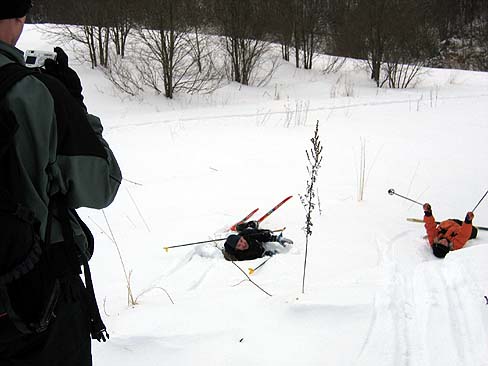 Plašajā sniega nogāzē J.A. pazuda ar galvu kupenā. Esot pēc tam sajutis mutē zemi. Kamēr steidzos viņu fotografēt, mani piemeklēja līdzīgs liktenis.