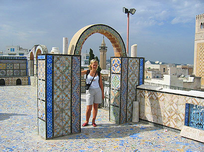 Mūsu pavadonis ienirst kādās veikaliņa durvīs. Kāpjam kādā piektajā stāvā, tad …tad izejam uz jumta terases un sastingstam uz brīdi. Mums pie kājām ir visa Tunisas Medina, augstāk par mums slejas tik dažu mošeju torņi. Tas bija tā vērts!